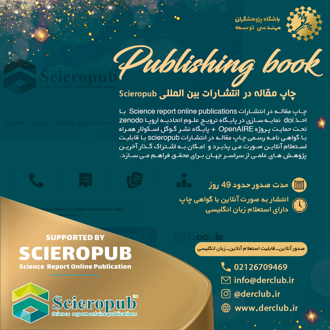 انتشارات بینالمللی Science Report Online Publications (Scieropub) فرصت استثنایی انتشار مقالات علمی را فراهم کرده است. با چاپ مقاله در این انتشارات، کد اختصاصی DOI دریافت خواهید کرد، مقاله شما در پایگاه Zenodo (اتحادیه اروپا) نمایه میشود و همچنین امکان انتشار در Google Scholar ایجاد میشود. خدمات چاپ مقاله همراه با گواهینامه رسمی و قابلیت استعلام آنلاین از ویژگیهای منحصربهفرد این سرویس است.